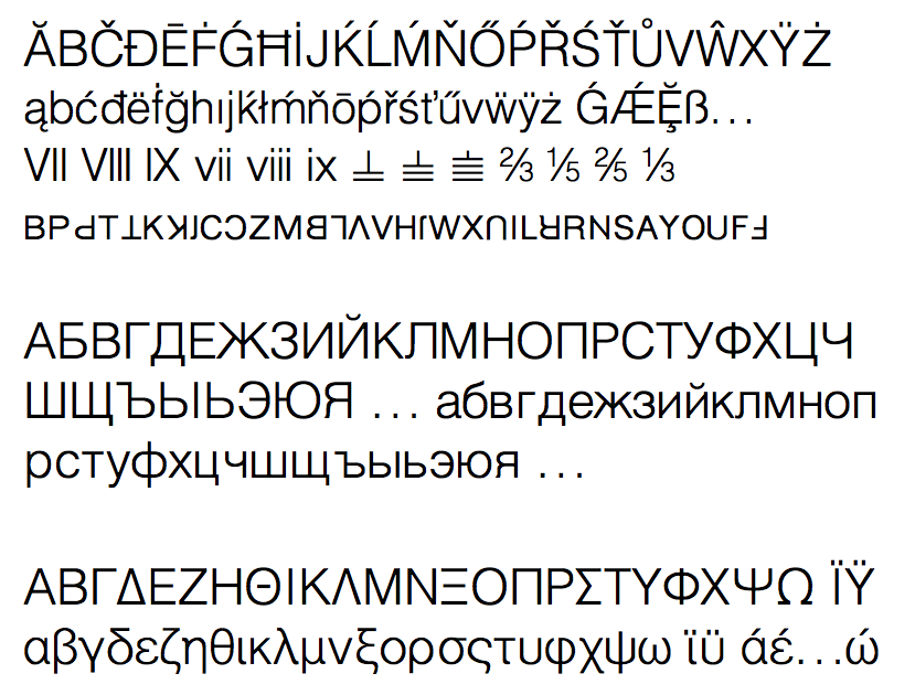 Bonus features: Punctuation, numerals, various mathematical, technical and other symbols, selected Dingbats.