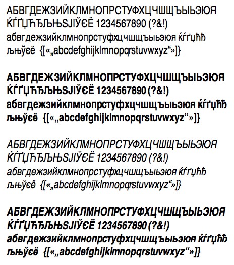 The professional solution for sans-serif Cyrillic! Also available for Mac OS 9, compatible with Language Kit, in PostScript and in TrueType.Weights: regular, bold, italic, bolditalic