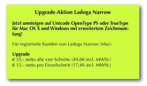 Need more Features? Ladoga Pro has more Cyrillic characters (non-Slavic), more Latin characters (East and West), more accents etc. -- Non-condensed variant is Ladoga. Price category / Preiskategorie: A (single weights) and C (all four weights)