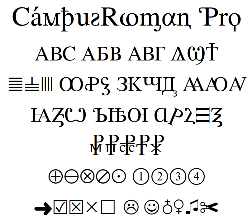 CampusRoman Pro: The MacCampus Unicode reference font. 5.000 characters in the font. Supports 133 Unicode 7.0 additions (Latin, Cyrillic, diacritics, punctuation, currency).