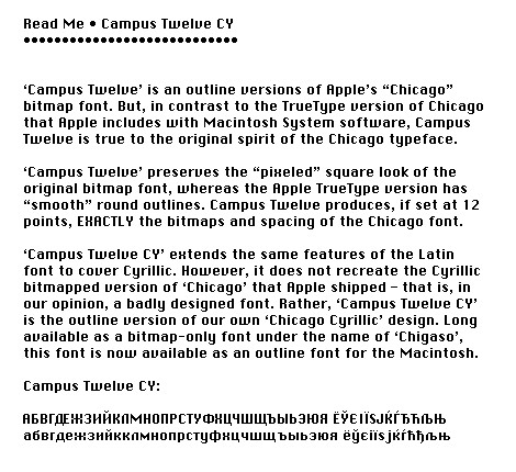 "Campus Twelve CY" is available in PostScript for Mac OS 9 and OS X, and also available in TrueType. Standard Mac Cyrillic encoding. Standard Western encoding: Campus Twelve.