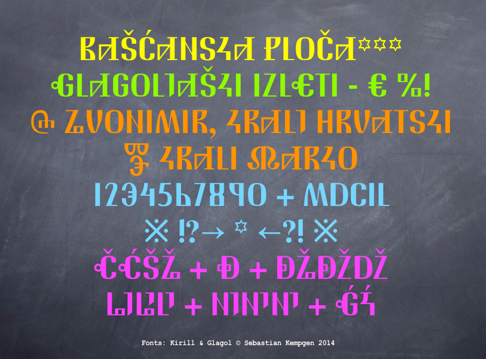 From v.3 these fonts have a matching basic Latin alphabet following the same desing principles as the Glagolitic fonts. Round and square Glagolica have different designs - see above! This is a first in typographic cross-over design for Glagolitic.