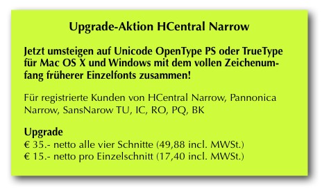 Updates and Upgrades available to registered customers. Update: PostScript-Version of HCentral Narrow for Mac OS 9 and OS X, language kit and Unicode compatible. EUR 25 net. Upgrade: to OpenType PostScript version for OS X (and Windows). EUR 35.-