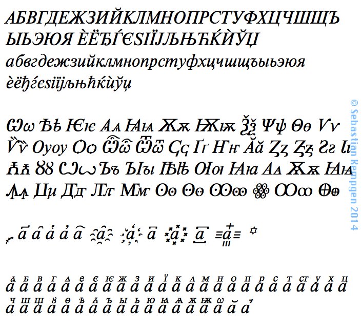 Character set: Slavic Cyrillic incl. complete historic orthography. Includes all superscripts, titla, number signs etc. See samples page.