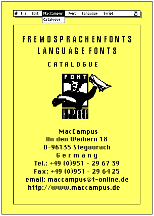 How to order: 1) Send your order (or inquiry) directly to MacCampus (see email on catalogue cover). 2) Receive your invoice (pdf). 3) Send your payment via PayPal to MacCampus. 4) Receive the fonts by e-mail.